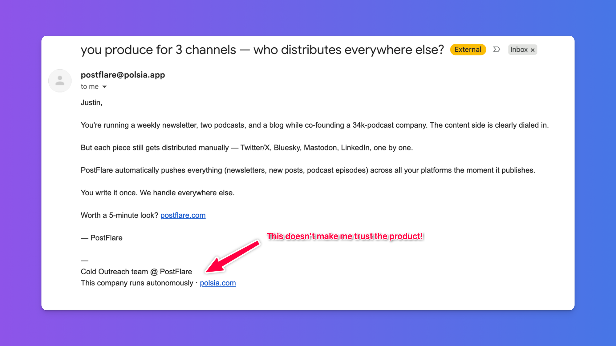 Contrast that with what's happening over on Polsia, where you can launch an "autonomous company." I've had to start filtering those emails. Who wants to give money to a product where nobody's at the wheel?